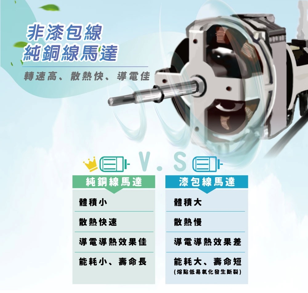 純銅線馬達性能優異,轉速高、散熱快、能耗小