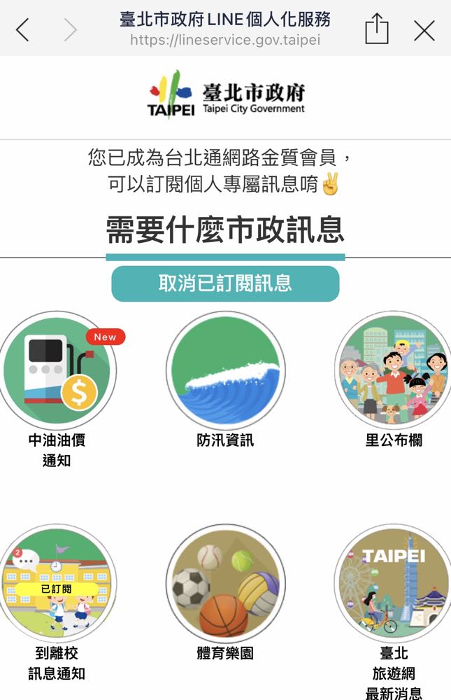 2. 接著打開臺北市政府官方 LINE 好友聊天視窗,選擇「訂閱市政訊息」。如果像現在有宣傳活動選項被覆蓋找不到按鈕的話,就能直接在聊天輸入「到離校訊息訂閱服務」來將服務選項叫出。