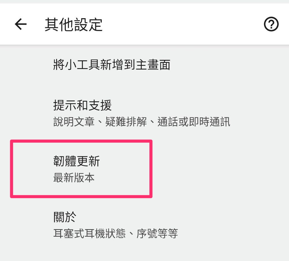 3. 選擇 Pixel Bud 的「設定」圖示後向下捲動並依序選取 [其他設定] >>> [韌體更新]。