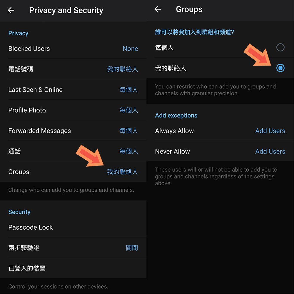 如果你也有相同經驗,可能還會觀察到,比起 IG、WhatsApp,Telegram 似乎特別容易收到垃圾訊息,那是因為 Telegram 預設的隱私設定,讓陌生人可以透過電話號碼、帳號、People Nearby (一種查看附近的人、本地群組的功能)找到你。因此只要修改一下設定,就不會再被陌生人加入奇怪的群組。