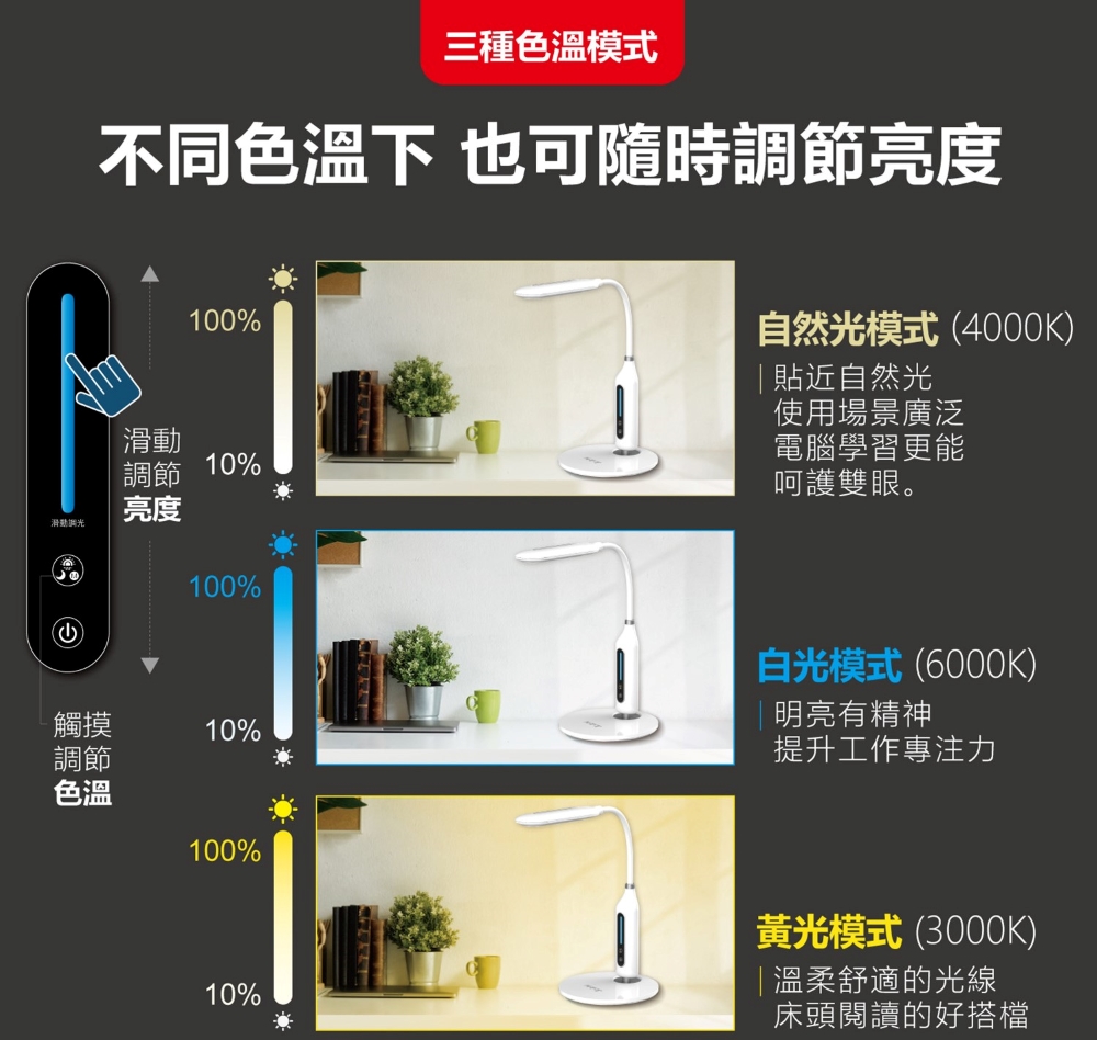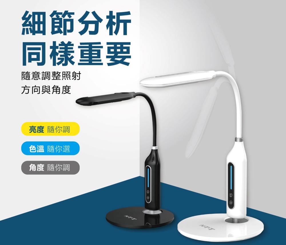 值得一提的是,HTT LED 時尚護眼檯燈 (HTT-1072) 擁有白光、黃光及自然光三種色溫,可依照不同的使用狀況任意調整,像是使用電腦查資料或線上學習時可選擇自然光模式、寫作業或讀書時可以選擇白光模式、睡前想要看個課外讀物放鬆一下則可選擇黃光模式,每個色溫都可以任意調整亮度及照射角度,方便使用者依需求使用。