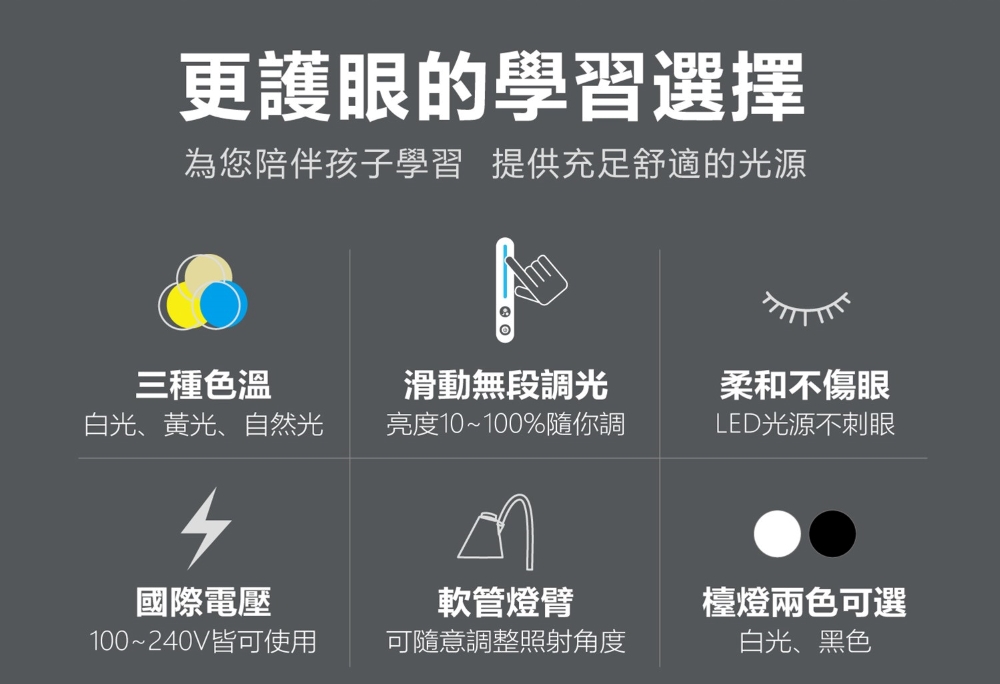 HTT LED 時尚護眼檯燈 (HTT-1072) 具備六大特色,分別是三種色溫可調、滑動無段調光、柔和不傷眼的 LED 光源、國際電壓、可隨意調整角度的軟管燈臂,以及可輕易融入各種書房、臥房的配色,能有效提供孩子充足舒適的光源,大幅改善讀書環境並帶來更好的護眼效果,讓孩子可以更安心的學習。