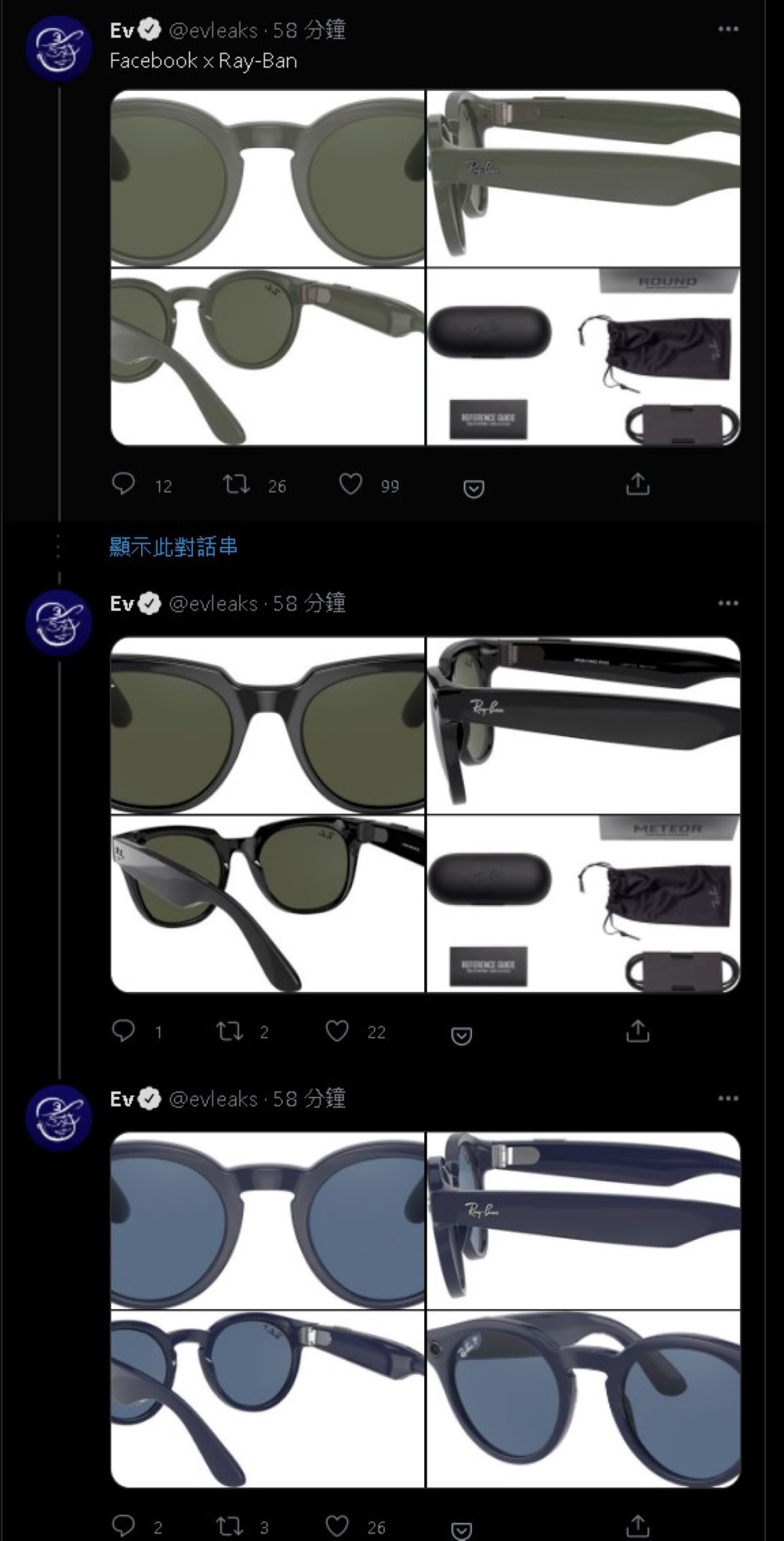 根據爆料者提供的產品圖,暗示這款眼鏡至少有兩種鏡框造型、三種顏色選項。圖中還能看見鏡片兩側各配備一組鏡頭、麥克風;右端的鏡腳上有一個實體按鍵,具體功能不明。但從鏡腳的體積來判斷,主要零件可能都藏在此處。