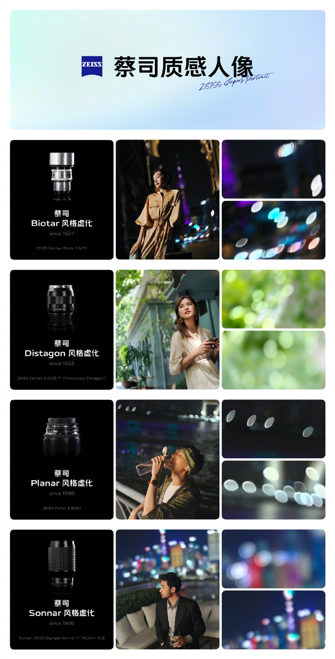 比較特別的是 vivo 和蔡司共同選取了蔡司 ZEISS Contax Biotar 1.5/75、ZEISS Contax Distagon 2.0/28 T*、ZEISS Hasselblad Planar 2.8/80、ZEISS Olympia Sonnar T* 2.8/180 這四款經典鏡頭,並復刻到 vivo X70 系列之中,組成全新的「蔡司鏡頭包」。