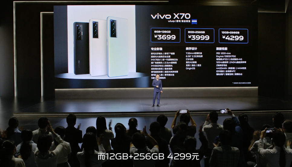 售價分別為 vivo X70 8GB+128GB 人民幣 3,699 元(約 NT$ 15,900)、8GB+256GB 3,999 元(約 NT$ 17,200)、12GB+256GB 4,299 元(約 NT$18,500);