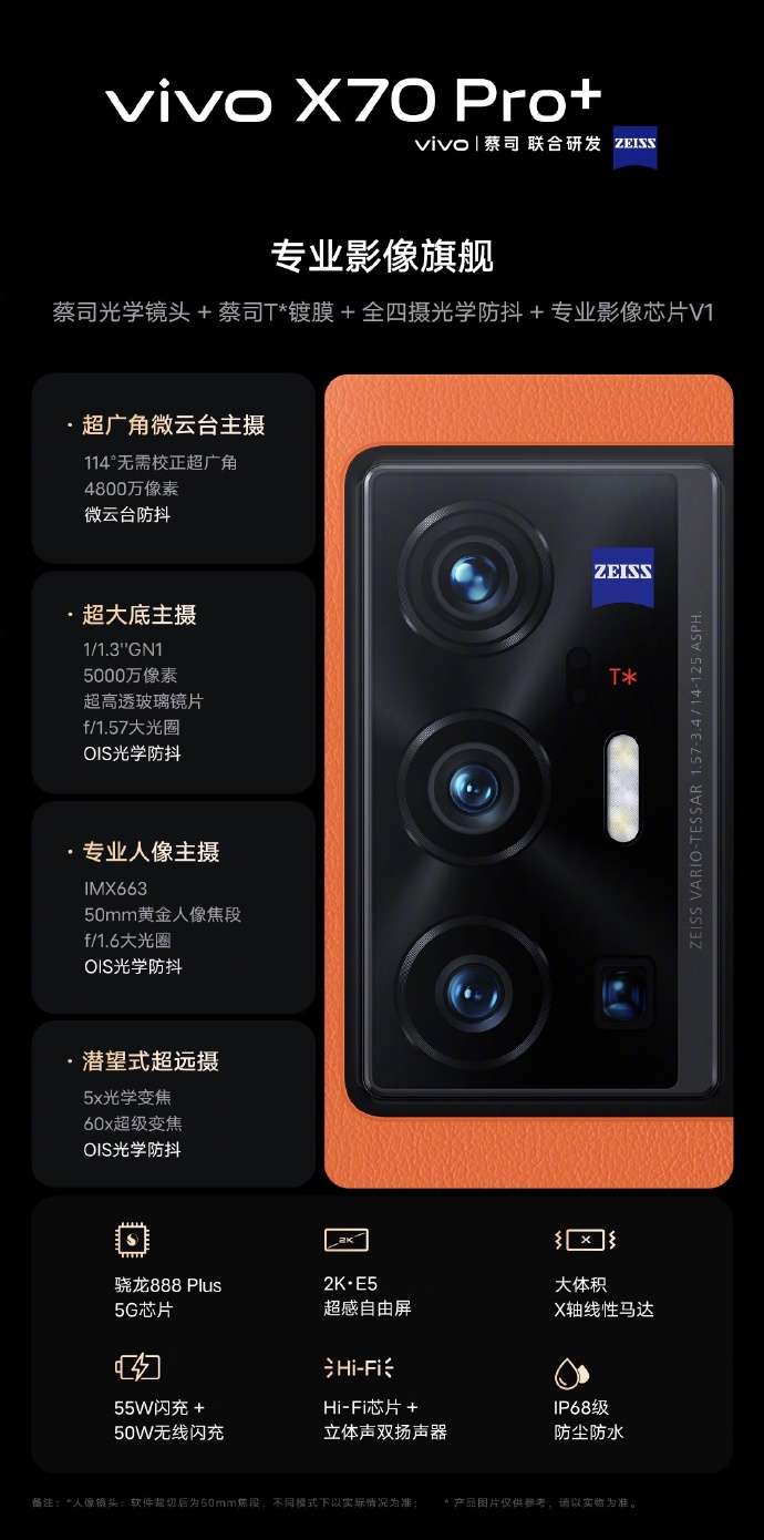 vivo X70 Pro+ 搭載 6.78 吋 2K E5 AMOLED 曲面螢幕、高通 S888+ 5G 處理器、4500mAh 電池容量、55W 閃充、50W 無線閃充、10W 反向無線充電、雙喇叭、IP68 防水防塵、無線充電、紅外線遙控。