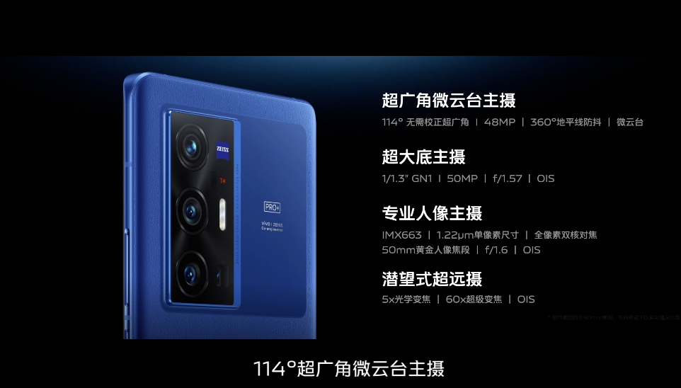 vivo X70 Pro+ 使用了 48MP 114 度超廣角鏡頭,(支援超神奇的 360 度地平線防手震功能,只要鎖定好對象,不管 vivo X70 Pro+ 怎麼轉著錄,畫面都是正的)、 50MP f/1.57 OIS 主鏡頭、IMX663 f/1.6 人像鏡頭與同樣搭載 OIS 的潛望式鏡頭( 60x 超級變焦與 5x 光學變焦),四鏡頭皆搭載 OIS 光學防手震。