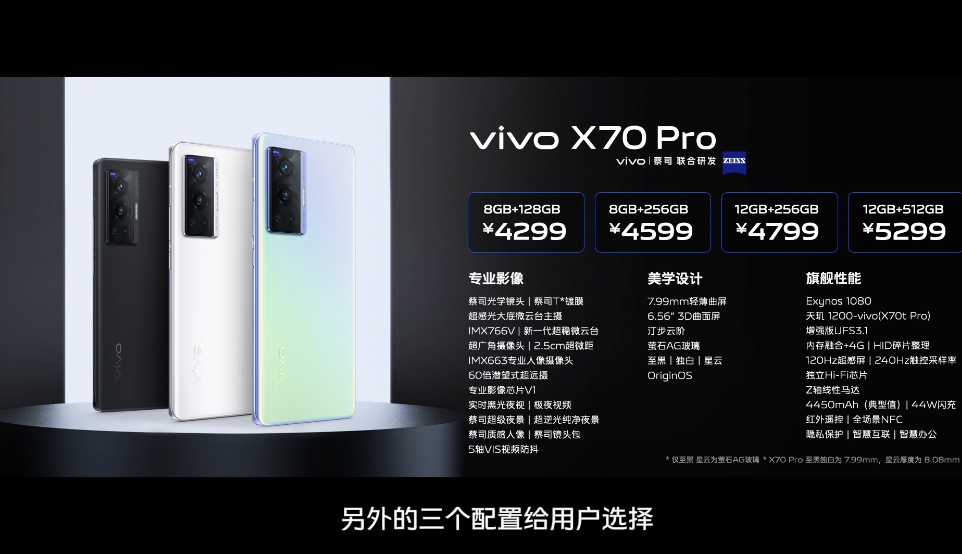 vivo X70 Pro 8GB+128GB 4,299元(約 NT$18,500)、8GB+256GB 4,599 元12GB+256GB 4,799 元(約 NT$19,600)、12GB+512GB 5,299 元(約 NT$ 22,600)。
