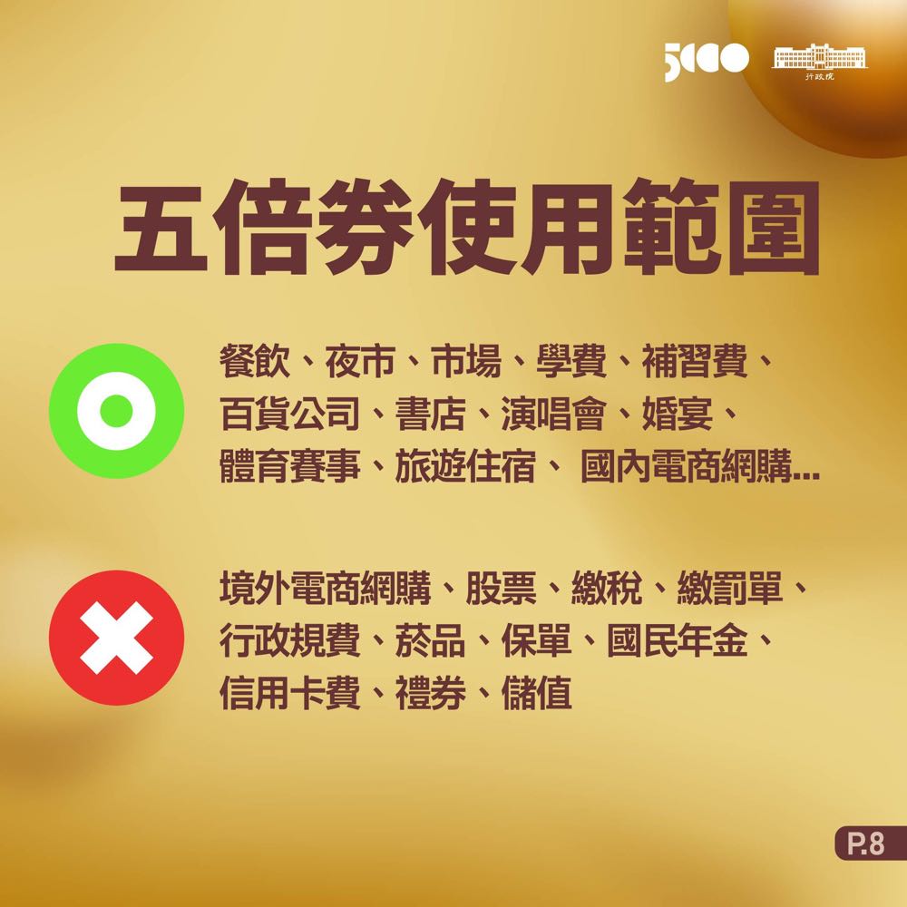 A:五倍券使用範圍包括餐飲、夜市、市場、學費、補習費、百貨公司、書店、演唱會、婚宴、體育賽事、旅遊住宿,比較特別的是此次還包括了國內電商網購!