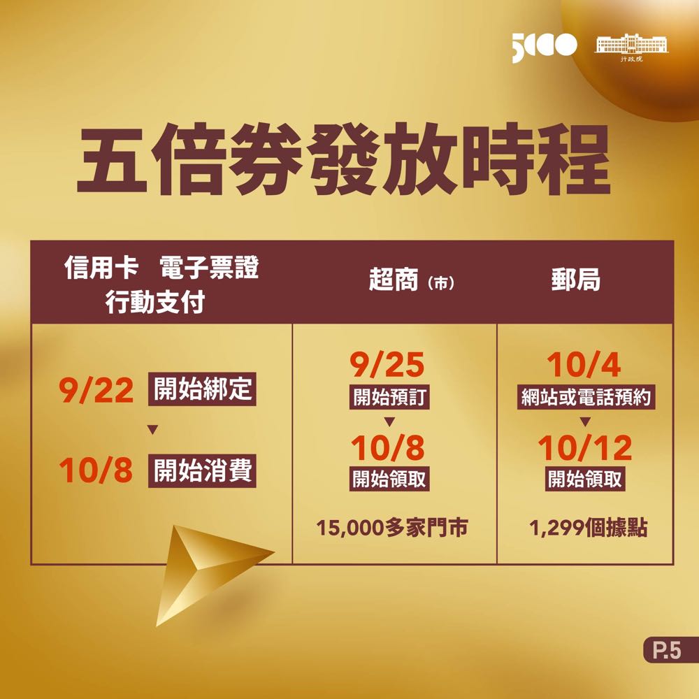 行政院稍早證實五倍券將於 9 月 22 日起開放信用卡、行動支付綁定,並於 10 月 8 日起可以開始消費。這邊我們也整理一下此次 5 倍券的適用範圍、領取資格、領取時間等資訊讓大家在領取前可以先參考唷!