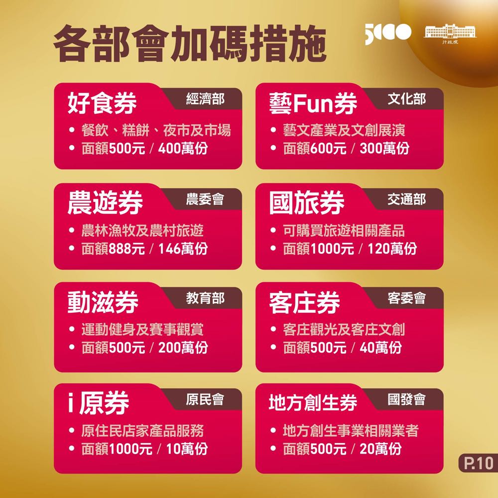 A:除了台北市的熊好券還有經濟部加碼的好食券、文化部的藝 Fun 券、農委會的農遊券、交通部的國旅券、教育部的動滋券、客委會的客庄券、原民會的 i 原券、國發會的地方創生券也將會陸續開放。