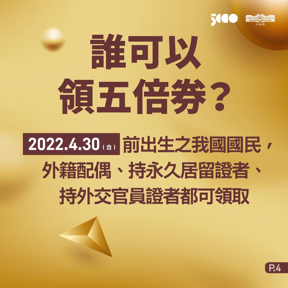 A:2022 年 4 月 30 日(含)前出生的中華民國國民、外籍配偶、持永久居留證者、持外交官員證者都可以領取。