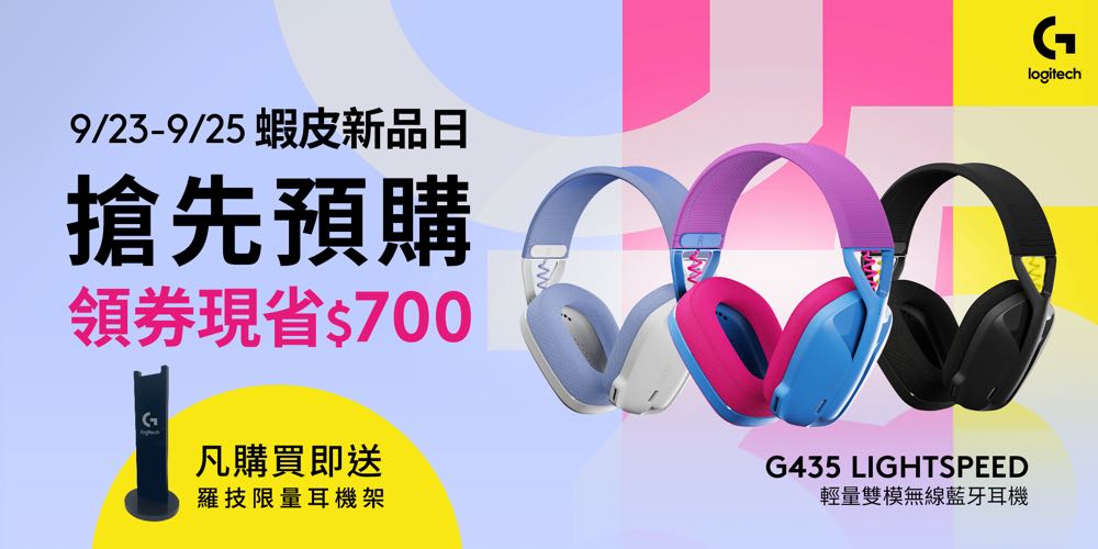 Logitech G G435 輕量雙模無線藍牙耳機售價 $2,990,9 月 23 日至 9 月 25 日將於蝦皮超級新品日推出火熱預購,預購即加贈限量耳機架,數量有限,送完為止。期間領取 $700 限量預購折價券,更享 $2,290 超值優惠驚喜價!限時三天,讓使用者娛樂隨行不受「線」,暢玩享樂不受限!