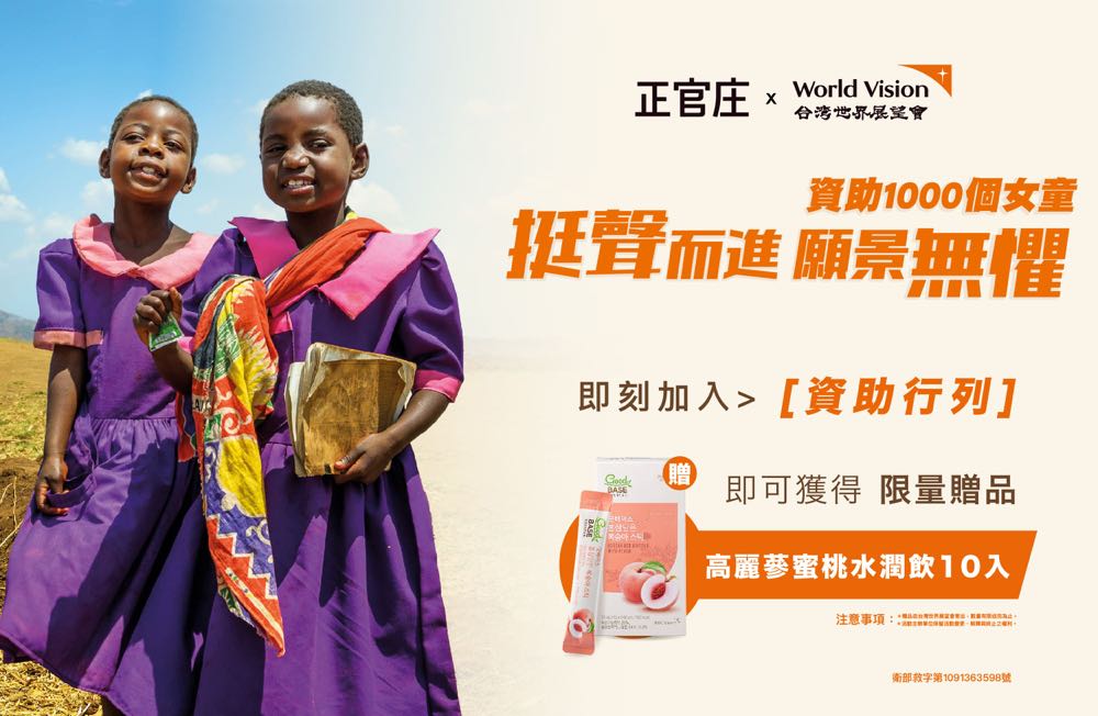 每個女孩都渴望擁有同等權益,能夠勇敢蛻變、成長,追求理想!台灣世界展望會發起「資助 1000 個女童 挺聲而進 願景無懼」行動,為至少 1,000 名弱勢女童募集資助人,邀請社會大眾和方莞靈、江念欣、陳奎儒一起關心全世界弱勢女孩,響應資助兒童或定期捐款,幫助她們免於恐懼、改善生活、認識權益、接受教育,翻轉生命和未來!此外,愛心企業正官庄為響應「資助 1000 個女童 挺聲而進 願景無懼」,熱情贊助「新增資助禮」以感謝各界愛心。即日起至10/31,凡透過台灣世界展望會官網線上資助國外女童並完成第一筆資助捐款(限線上刷信用卡,含銀聯卡、 WEB ATM、LINE Pay),即可獲贈正官庄「高麗蔘蜜桃水潤飲」乙盒(10包入,市價$600),限量 800 份,贈完為止;活動期間,正官庄全台門市也設置「資助 1000 個女童 挺聲而進 願景無懼」創意互動海報,歡迎大眾前往掃描 QR Code,聆聽女孩真實心聲。