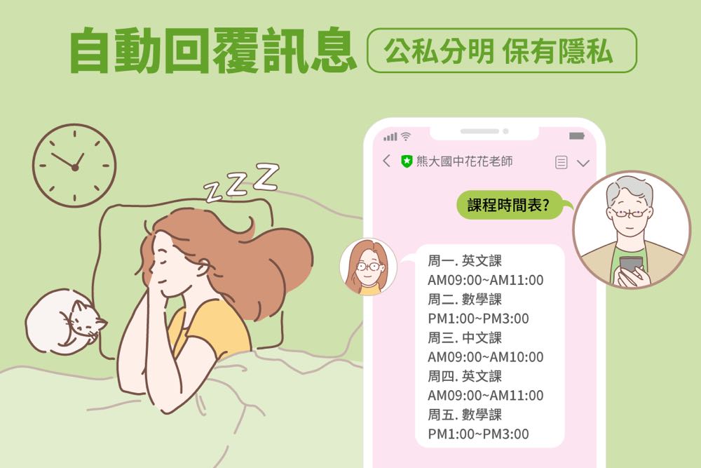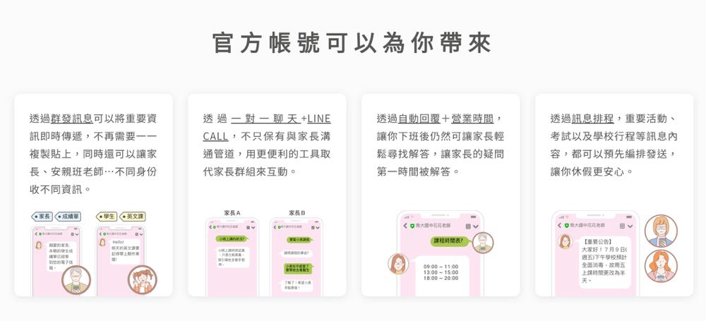 使用 LINE 官方帳號,可以清楚區分私人訊息與家長重要來訊,下班後可設定「自動回覆」,不僅可讓老師休息時間不被打擾,對來訊者亦不失禮。此外,還可針對常見提問設置「關鍵字回應」,即時提供解答。