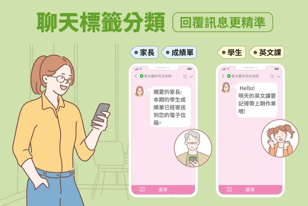 一對一聊天除上述優點,更提供「標籤」功能,老師可為每個對話框做標記、進行分眾管理,從粗略區分「學生」、「家長」,到仔細標記「需補考」、「參加畢旅」等不同標籤,不但簡單扼要地替老師筆記下家長與學生的狀態,更能依據不同標籤精準回覆,或群發訊息給特定標籤對象,管理更輕鬆。