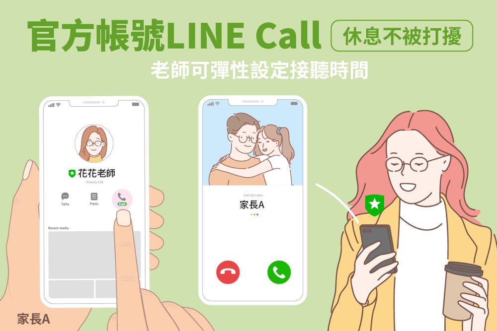 老師們日間在學校忙於備課教學、與學生互動,晚上有時也須與家長通話,不知不覺間犧牲了老師的休息時間與生活。LINE 官方帳號提供 LINE CALL 功能,老師可彈性設定電話接聽時間。