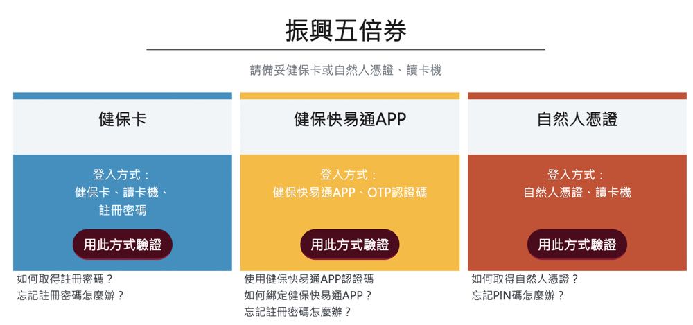 先想好要選擇「信用卡」、「電子票證」或「行動支付」。接著準備讀卡機,以及每位「主綁定人+被綁定人」的健保卡,前往「振興五倍券」官網進行共同綁定。