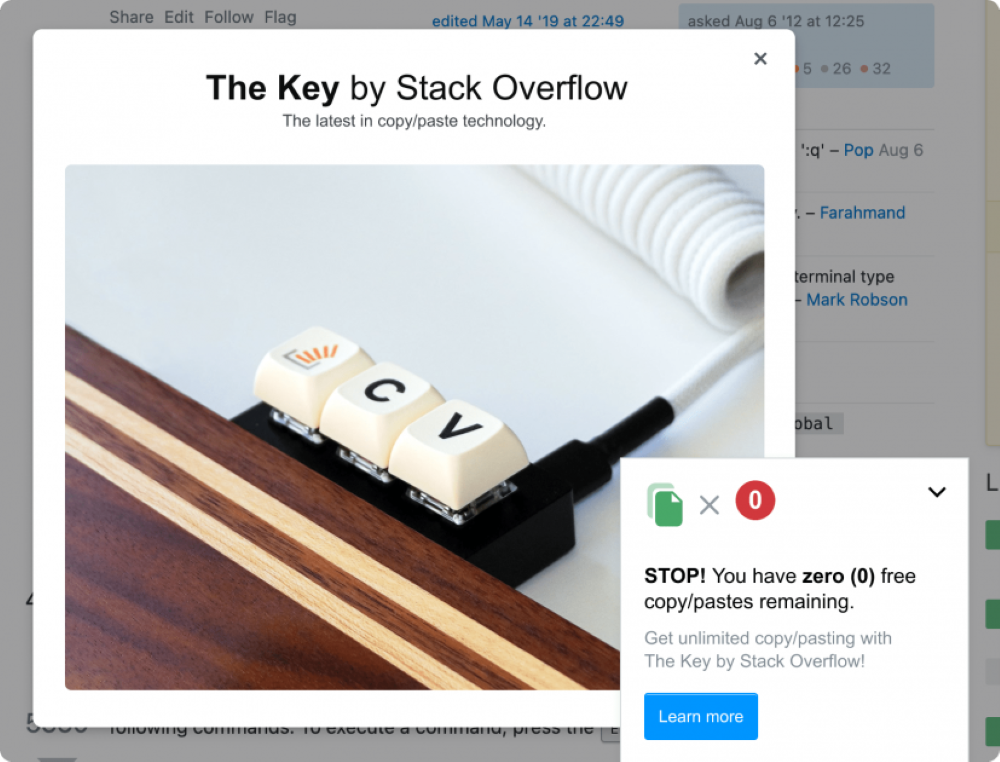 不過 Stack Overflow 團隊並不反對複製行為,為了慶祝今年的愚人節,還特別為網站設計了一個彩蛋。只要在網站中執行複製動作,畫面會跳出禁止通知,必須購買「The Key」才能解鎖複製功能。