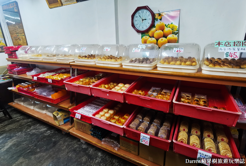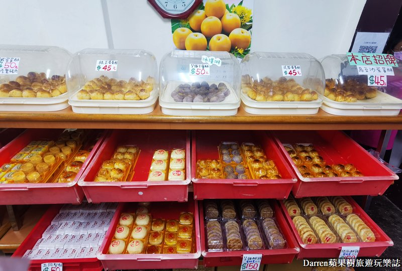 兩旁共有3層架上都是滿滿的蛋黃酥、月餅、糕餅等等,光是蛋黃酥的口味就有不少選擇,可以單買也有盒裝,分為6盒裝或12盒裝,價位都有寫在上面
