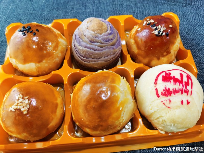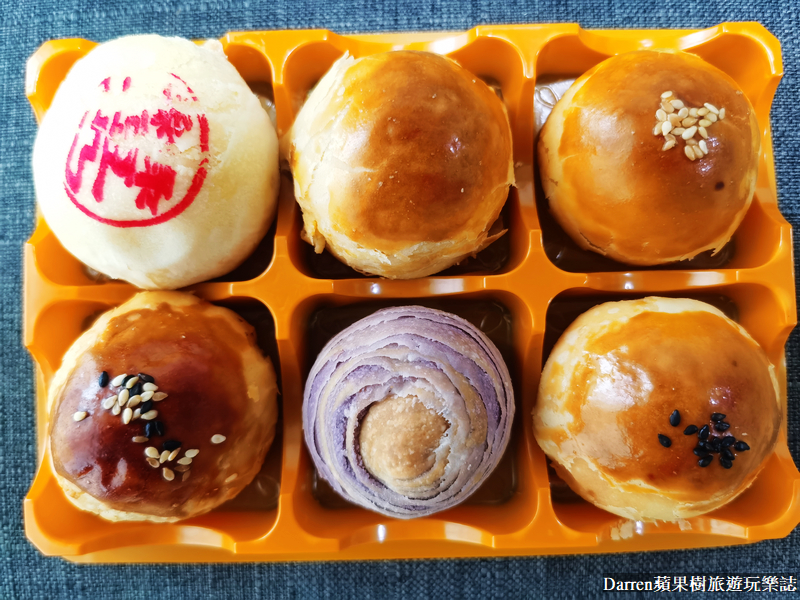 烏豆沙蛋黃酥、鳳梨蛋黃酥、芋頭千層酥、綠豆沙蛋黃酥、芋頭蛋黃酥、綠豆凸,價位在35~50元之間