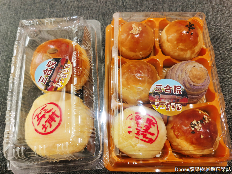 我買了一盒6盒裝的蛋黃酥,自己配反正就是不同口味各一,另外還有客家月餅以及帝王酥各一,盒裝上面都貼著三合院手工蛋黃酥