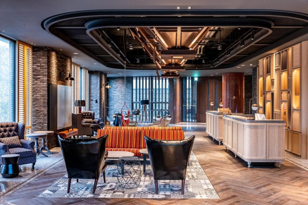 走進捷絲旅台南十鼓館大廳就感覺很厲害,各種復古的沙發桌椅、壓花玻璃、紅磚牆與花磚地板搭配得相當好看,天花板還嵌入了巨型鐵製漏斗造型這樣代表著糖廠的元素,拍照效果很好,完全符合現在大家喜歡打卡的生活模式。