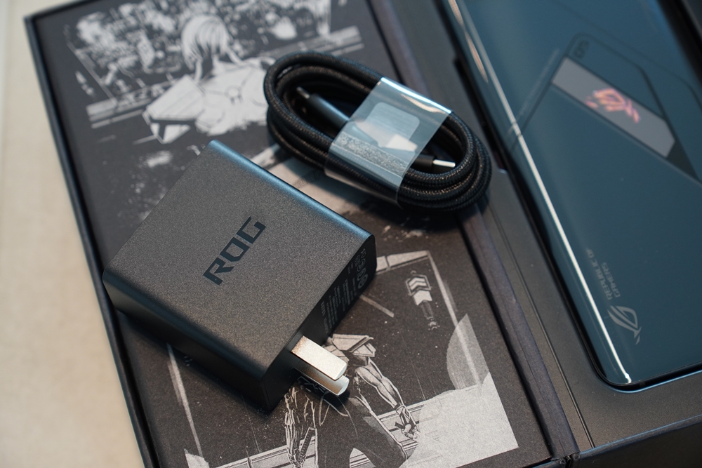 盒裝配件給的非常完整,包含 ROG Phone 5s Pro 手機,還有保護殼、65W 充電器、Type-C 充電線、連接埠防塵塞、空氣動力風扇 5 風扇、退卡針、ROG 貼紙等。