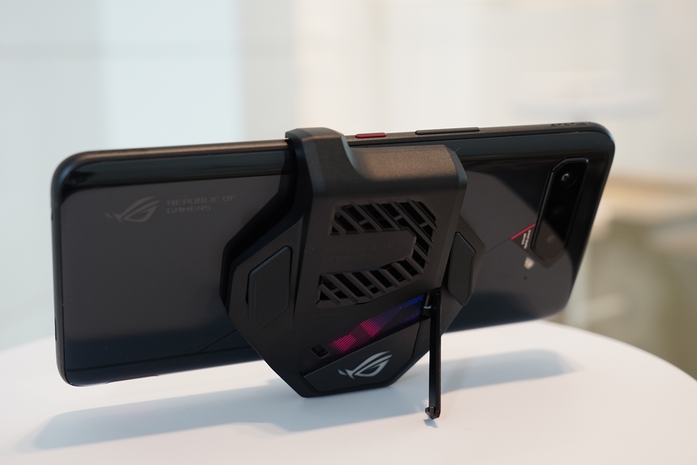 空氣動力風扇 5 風扇正對著處理器吹,官方表示可以降低 10 度的 CPU 溫度,表面更可以下降達 15 度,讓效能達到更穩定的輸出,除此之外,風扇側邊有兩個按鍵,握持時可以當作遊戲時的額外操控鍵使用,還提供了支架、3.5mm 耳機孔設計,外出時可以做為手機架使用,或是接上耳機沉浸在遊戲世界中。