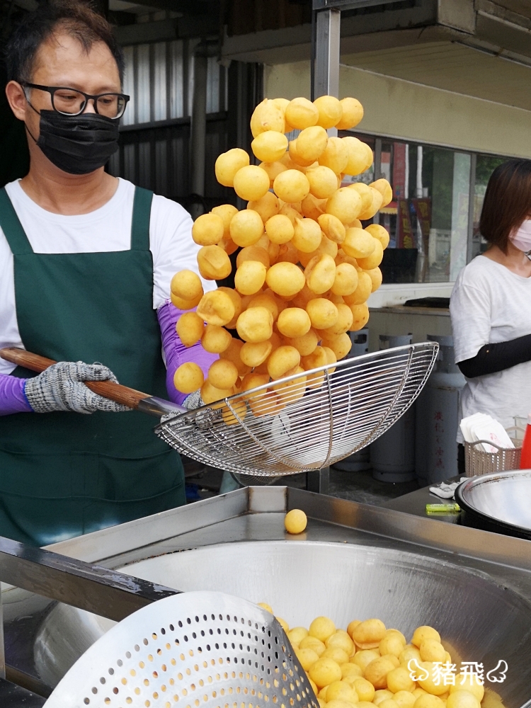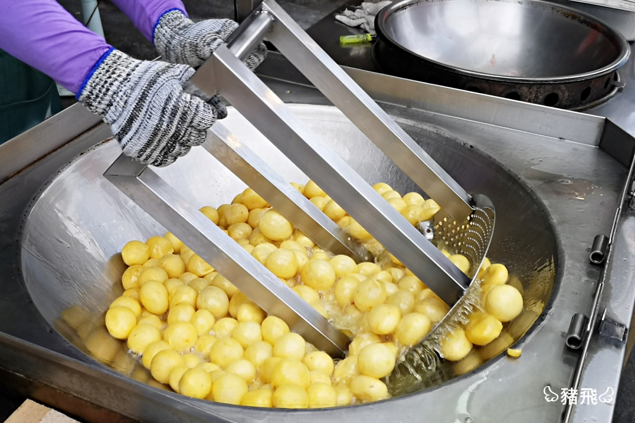 用特殊器具把地瓜球壓到膨脹後,再甩到半空中,不誇張,每一顆都快跟我拳頭一樣大了,豬飛在家也會做地瓜球,但要做到這樣大顆實在太難了。沒有功力再怎麼壓也壓不出來。
