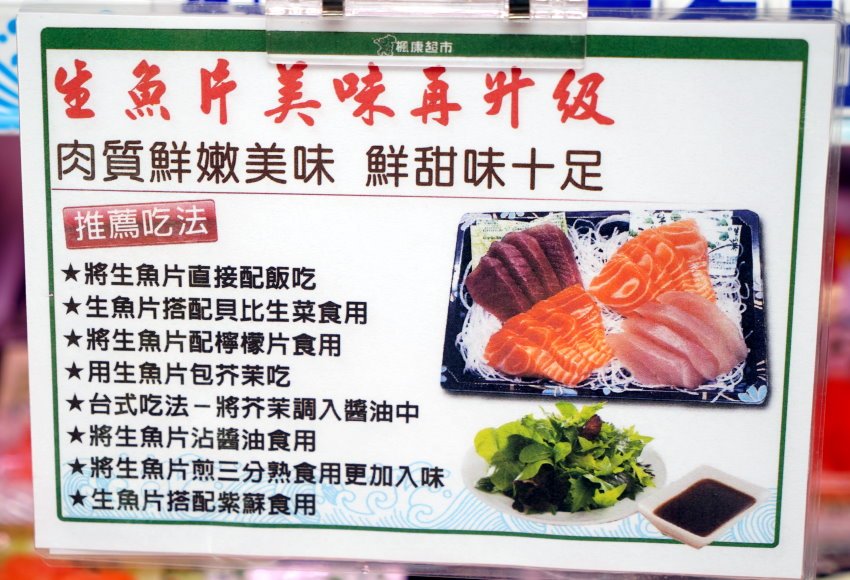 ▼「楓康超市」每週末都會有限量提供的生魚片特賣,看到這個DM我們眼睛都亮了啊~~而且不誇張,據說常常被搶到缺貨,我們真的是起了個大早特地來買,還好現場還有一些,真是感人!!有需求的朋友也可以直接跟店員預訂,就可以隨時吃到新鮮大盒又美味的生魚片啦!!