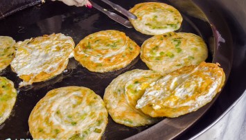 看著熱騰騰剛炸好的何家三星蔥餡餅,外皮焦酥帶金黃色澤,撒上胡椒後看起來更美味了~