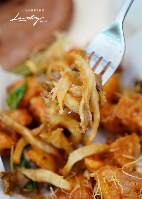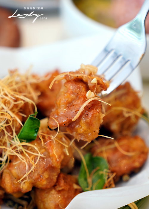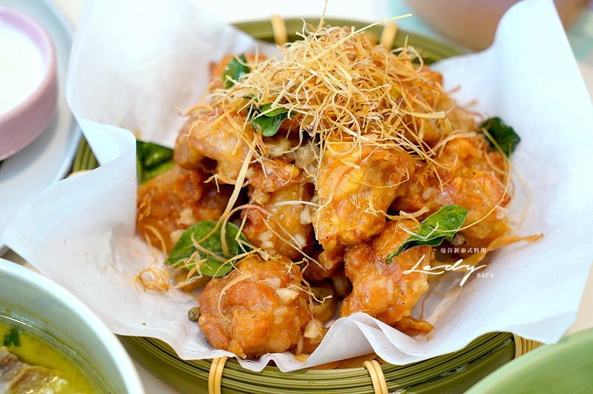 ▼香茅炸雞,採用竹籃盛裝,上頭撒有香茅絲裝飾提味,整個很有泰國風情!