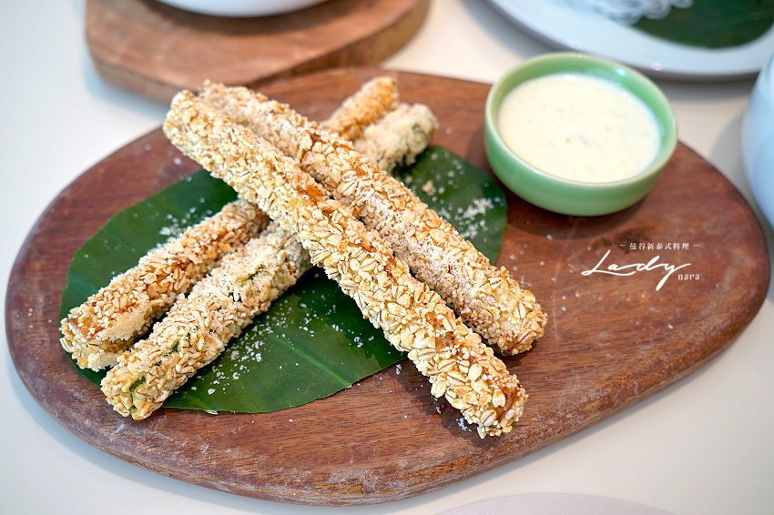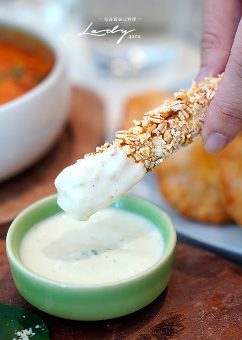 ▼燕麥炸櫛瓜,這道也是減醣料理,一旁搭配的是泰式凱薩醬,建議可以沾附享用更夠味!