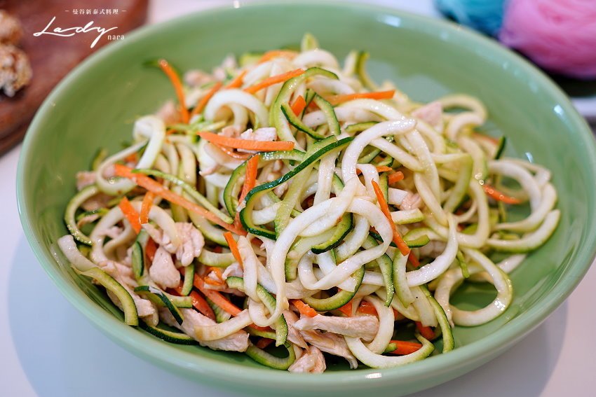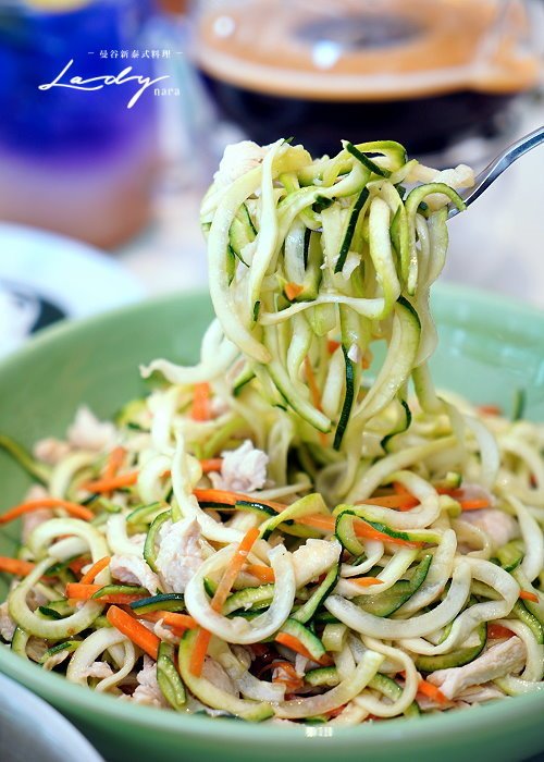 ▼翠綠的櫛瓜刨成細絲麵條狀,搭配蒜末、紅蘿蔔、雞肉等配料,吃起來清甜爽口,還帶有討喜的蒜香,搭配雞肉絲讓層次更加多元,一口就能吃到滿滿蛋白質與優質蔬菜,對身體也不會有太大負擔!