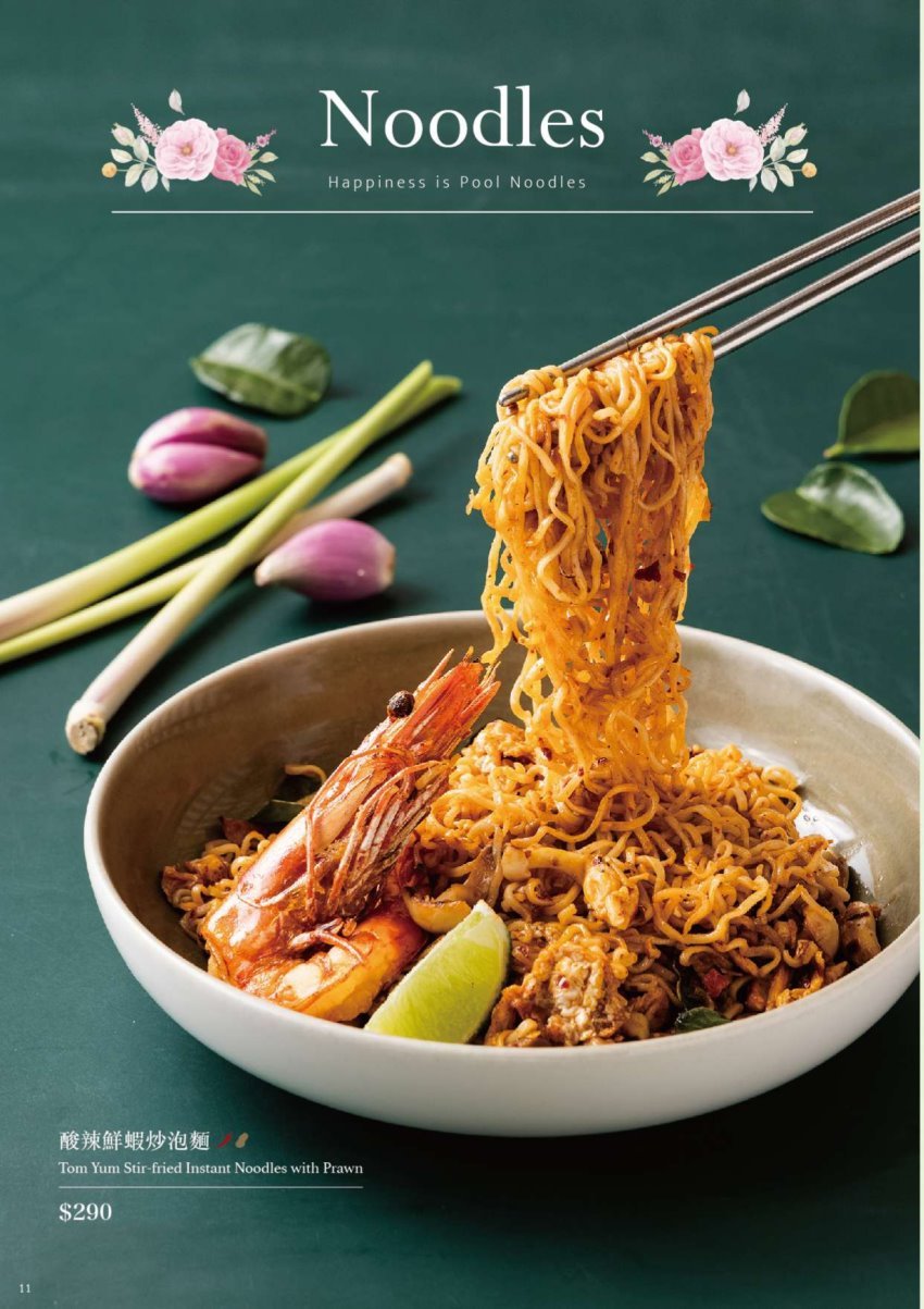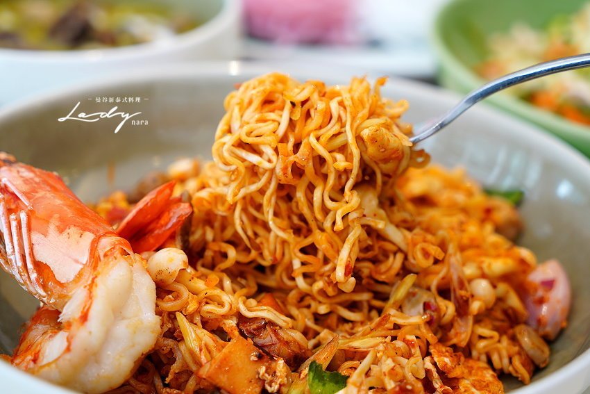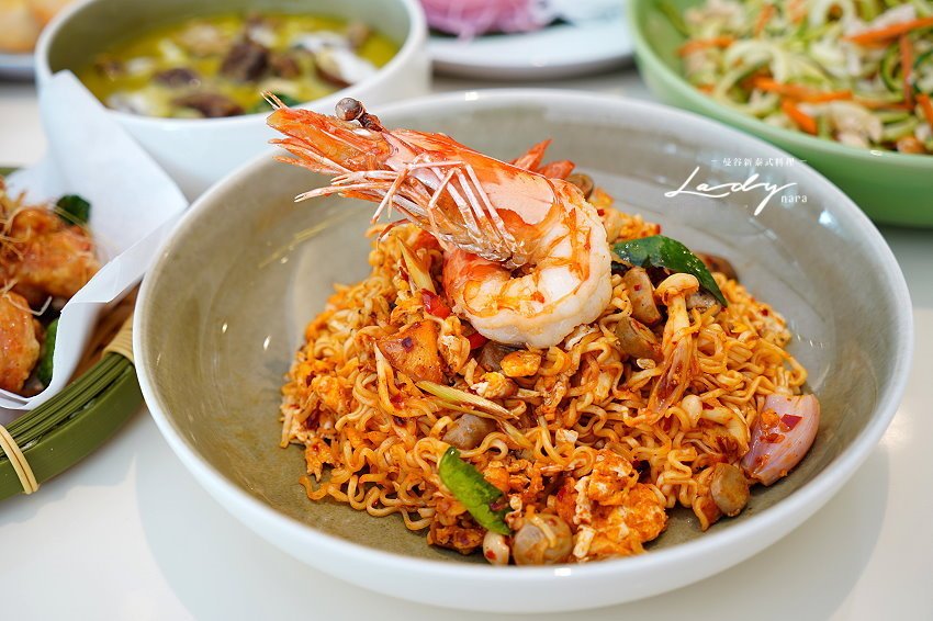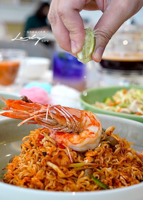 ▼酸辣鮮蝦炒泡麵,採用冬蔭風味特調醬搭配雞蛋、菇類等配料下去拌炒泡麵,上頭放上一整隻去殼大草蝦,光看就讓人口水直流!