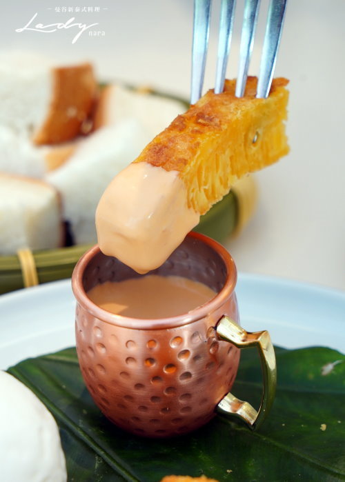 ▼黃金糕吃起來香Q綿密,帶有微微椰漿的獨特香氣,沾附泰奶醬更多了滑順口感,特別又美味!