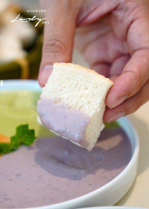 ▼三色迦椰蒸麵包,馬卡龍色系的三色沾醬拍起來也超夢幻,一共有芋頭、泰奶、斑蘭等三種口味,麵包也是店家自製,吃不夠還可續一次,包準超有飽足感(笑)!