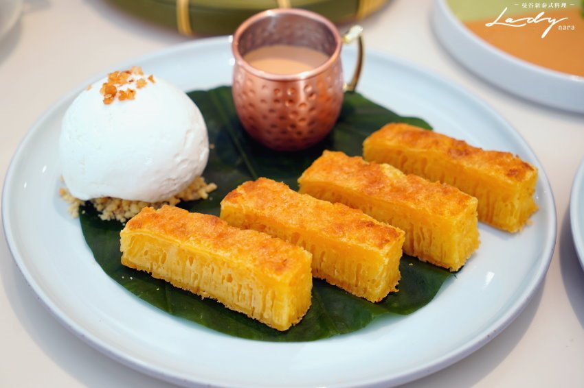 ▼印尼棉蘭黃金糕,製程繁瑣的黃金糕在印尼大多是用來招待登門的貴客或是作為節慶點心,富含對親友的濃厚心意與甜美祝福,現在在這裡也能享用得到!一開始建議先吃原味,一旁也有椰子冰淇淋、泰奶醬可供搭配享用~~