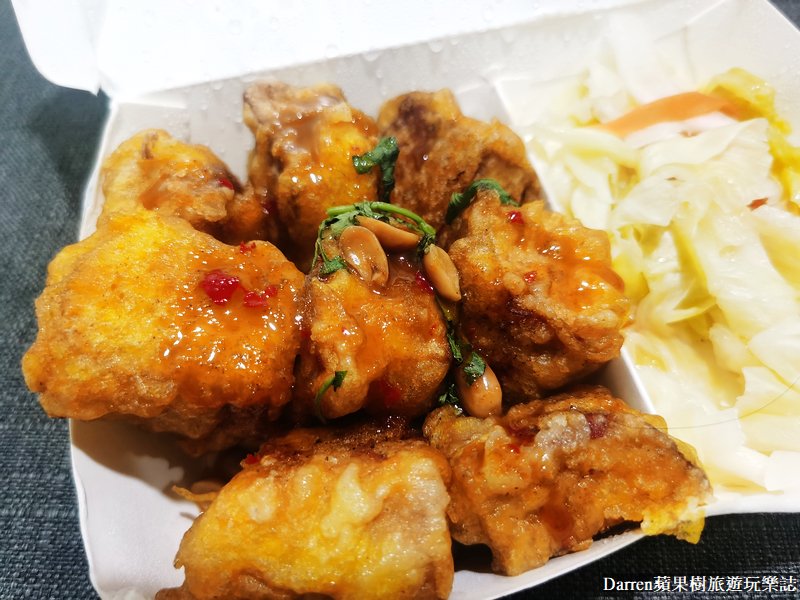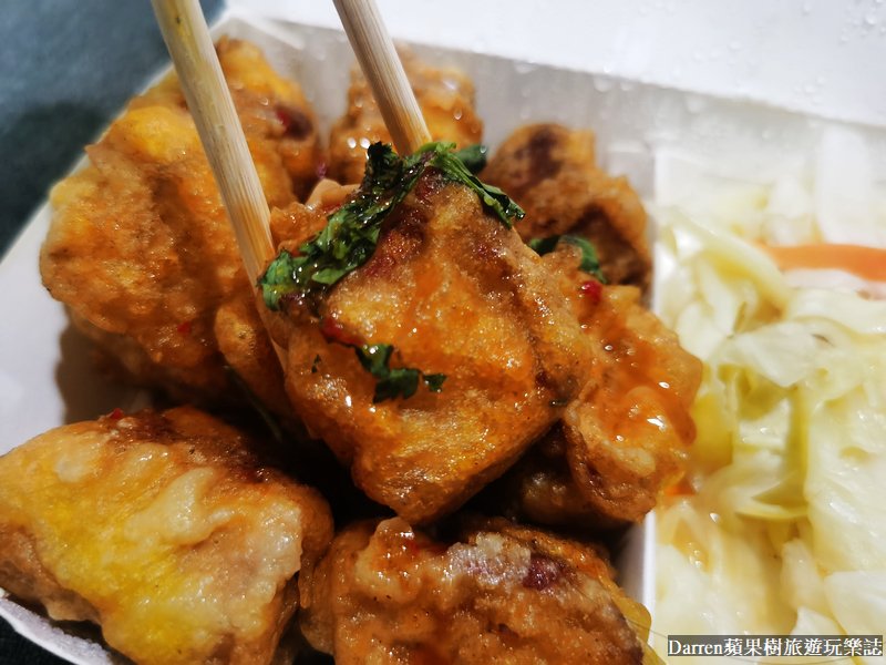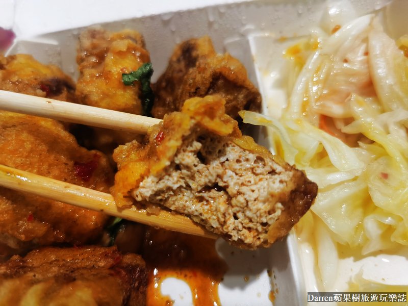 MR.臭脆皮泰式臭豆腐,外觀看起來就有點類似日式揚出豆腐的作法,外面一層酥脆麵衣,咬開裡頭是臭豆腐,口感較為軟嫩多汁,泰式醬汁讓臭豆腐多了酸甜滋味,因為我是外帶回家,所以麵衣有點濕潤,如果是在現場吃的話應該會更好吃