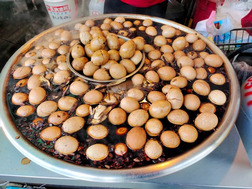 ▼現場有一大鍋滷得香噴噴的香菇茶葉蛋,光看就讓人口水直流啊!我們買4顆60元(7顆特價100元),一人先一顆就好,免得吃不下晚飯!
