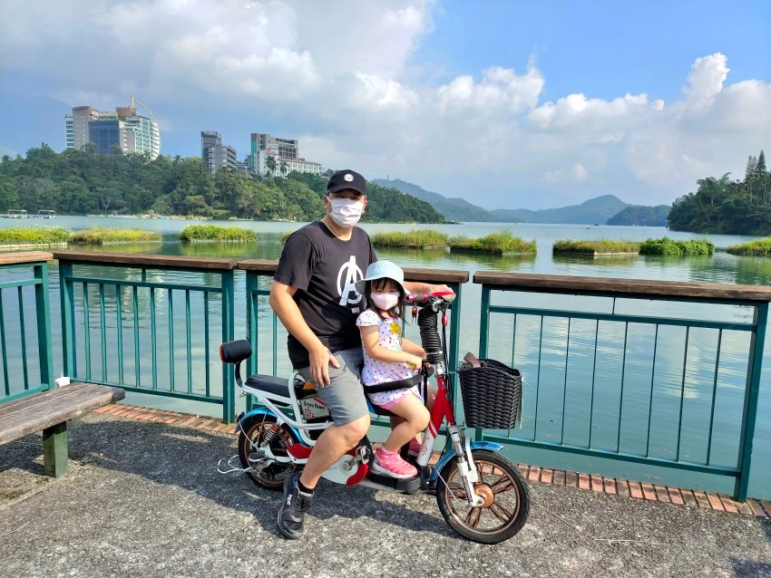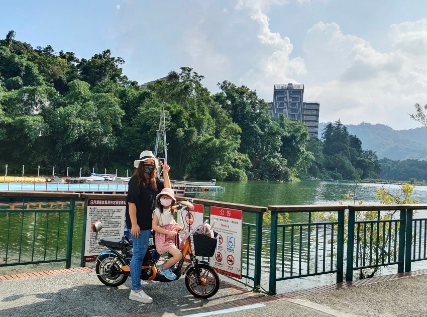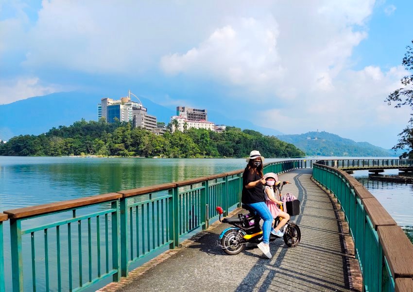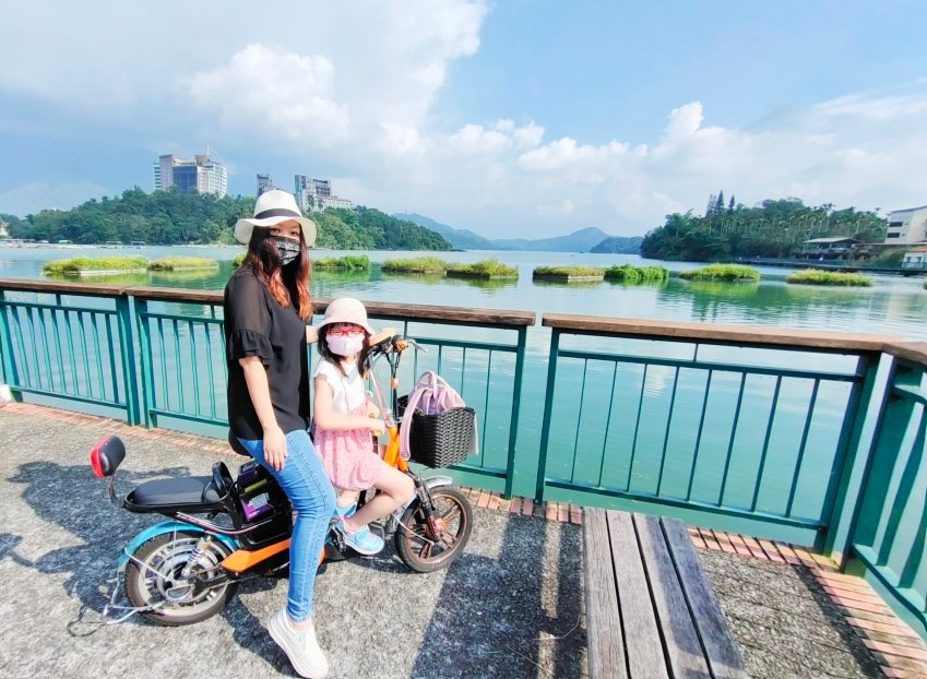 來南投日月潭絕不能錯過的就是這條被CNN評比為「世界十大最美自行車道」之一的「日月潭環湖自行車道」,我們第一天下午租借了電動親子自行車,騎在鄰近湖面的自行車道上真的是涼爽又舒暢!第一次帶小朋友騎的朋友建議可以像我們一樣,從水社騎到向山遊客中心,來回約6.8公里,慢慢騎也是可以玩兩小時左右,悠閒又不累~~尤其水社壩、向山懸臂式天空觀景台、向山遊客中心等都有絕美風景可以瘋狂拍照,很適合一家大小一起來玩耍!