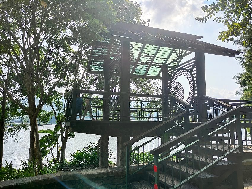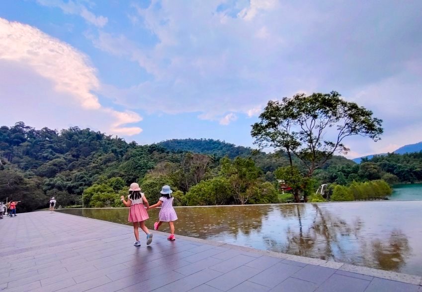 ▼沒多久就開始下起雨來~~躲雨的同時還可以在這裡逛逛賣店,也有咖啡廳可以稍作休憩,後方也有一片無邊際水池加上遠方的日月潭美景,隨手拍都超級漂亮!