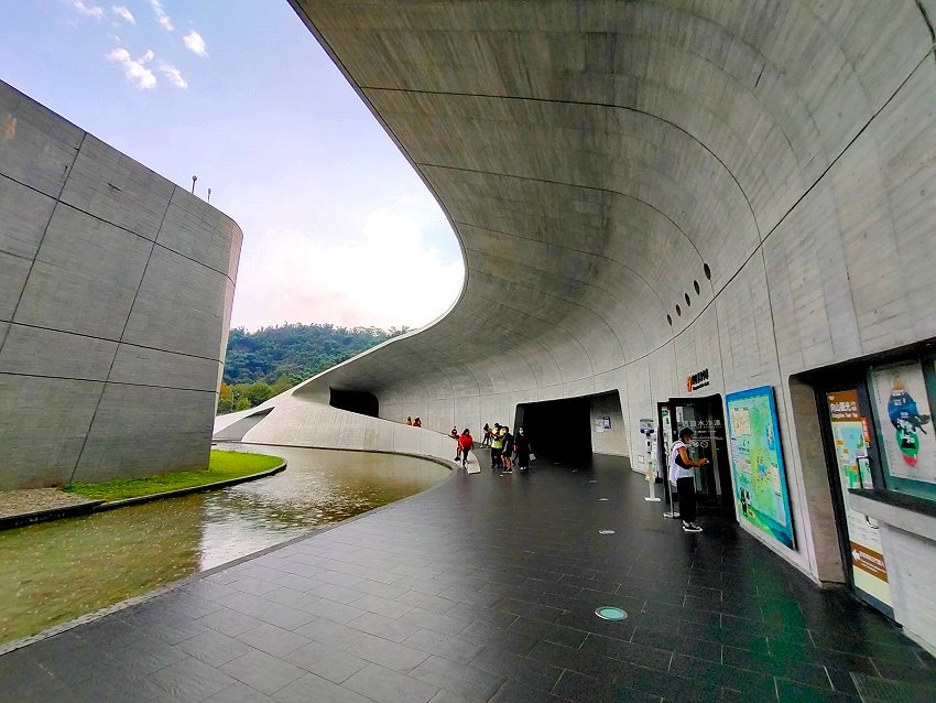 ▼「向山遊客中心」是由國際知名日本建築師「團紀彥」設計,以環抱日月潭為意象,搭配原有地景當作中心思想,斜坡式的草皮可以直通屋頂,加上多種弧形設計拉出眺望空間,融合清水模、水景、草皮搭建出人與自然的聯繫!