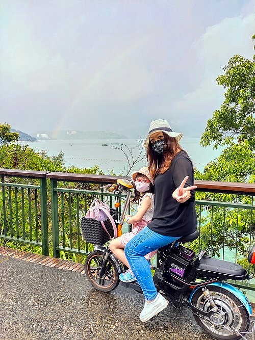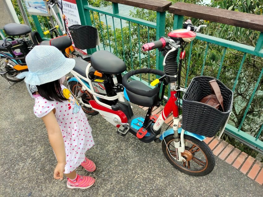 ▼休息差不多後我們又要騎著電動親子自行車出發啦~~是說我們租的這兩台車都很酷炫,顏色也很繽紛,騎起來也很舒服!