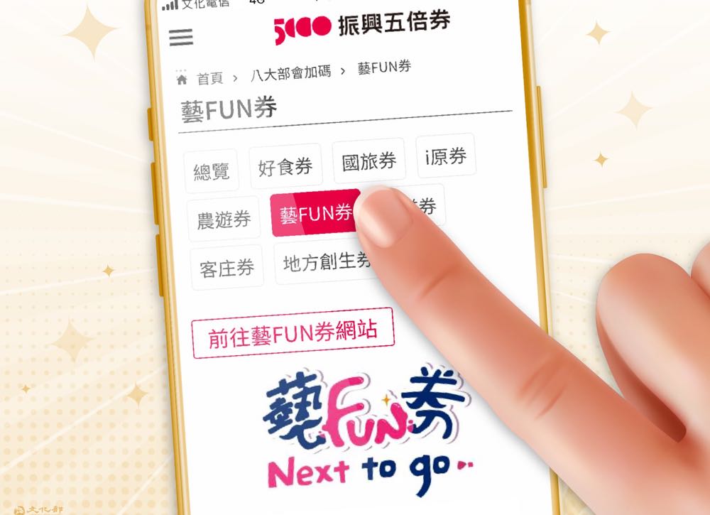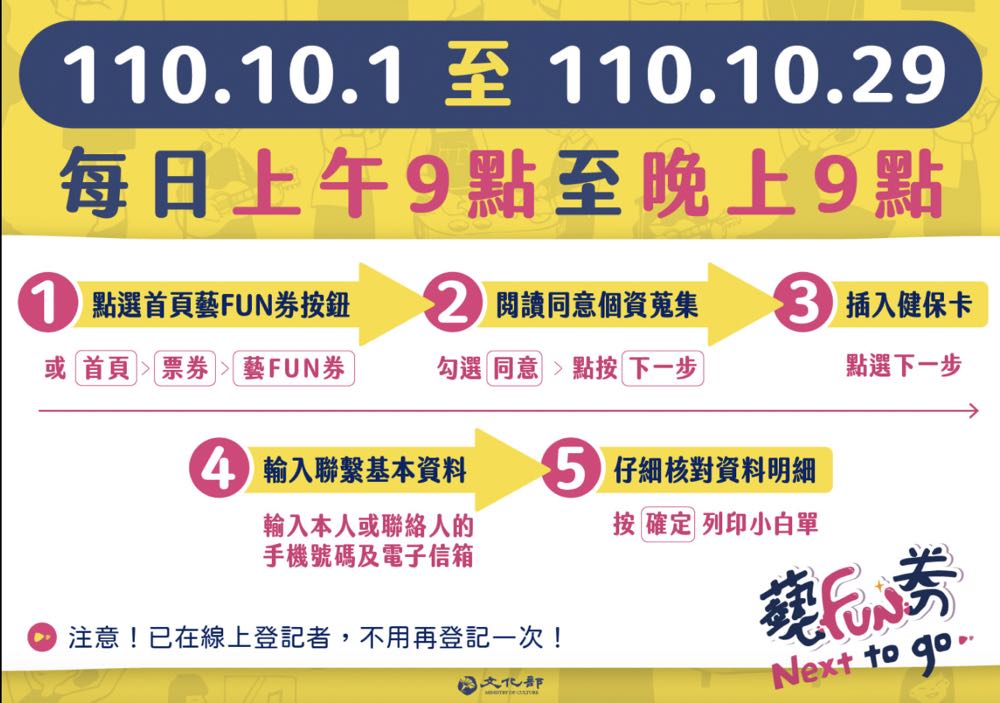 「藝FUN券」每人限領一次,數位券、紙本券僅能擇一,已經在五倍券官網登記的朋友不需要再去超商登記,紙本券遺失或毀損恕不補發,使用時不得找零、轉售。