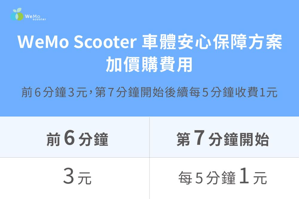 不分時段,用戶 24 小時可在 WeMo Scooter App 內即時加價購「車體安心保障方案」,創新性即買即保障模式,更加省時方便。「車體安心保障方案」採取每分鐘計費模式,前 6 分鐘 3 元,第 7 分鐘開始後續每 5 分鐘收費 1 元,若以 15 分鐘的車程僅需加價 5 元費用,將可得到車體意外修復費用的保障。WeMo Scooter App 內一鍵快速購買,花小錢享大保障,打造全新型態車體保障服務。