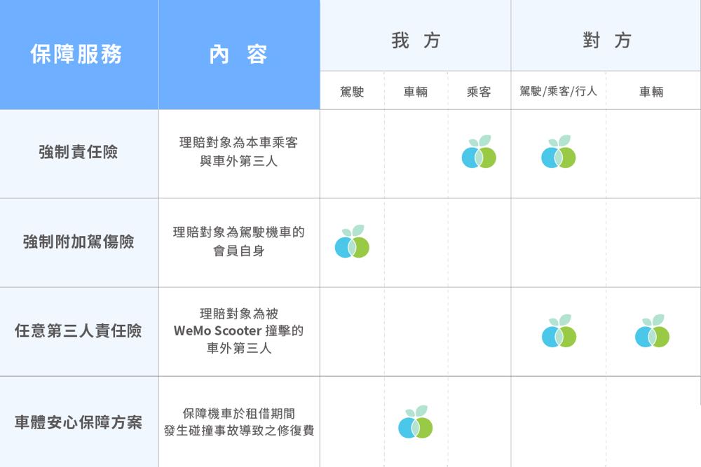 WeMo Scooter 致力提供安心與安全的智慧共享機車服務,每台車定期經專業營運團隊維護與保養,確保消費者安心使用。使用 WeMo Scooter 服務,每位用戶皆享有強制責任險、強制附加駕傷險及任意第三人責任險,每趟租車即享專屬三大保障。