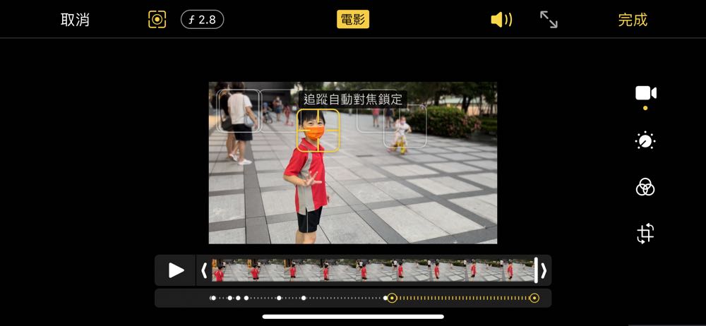 在預設的情況下,聚焦的主角會有著黃色的框框顯示,不過如果有其他人經過,聚焦主體會自動進行切換。這時我們可以選擇長按黃色的框框,便會啟動「自動對焦追蹤鎖定」,這時在錄影過程中就不用擔心旁邊有人經過而讓拍攝過程中主角畫面被模糊掉。