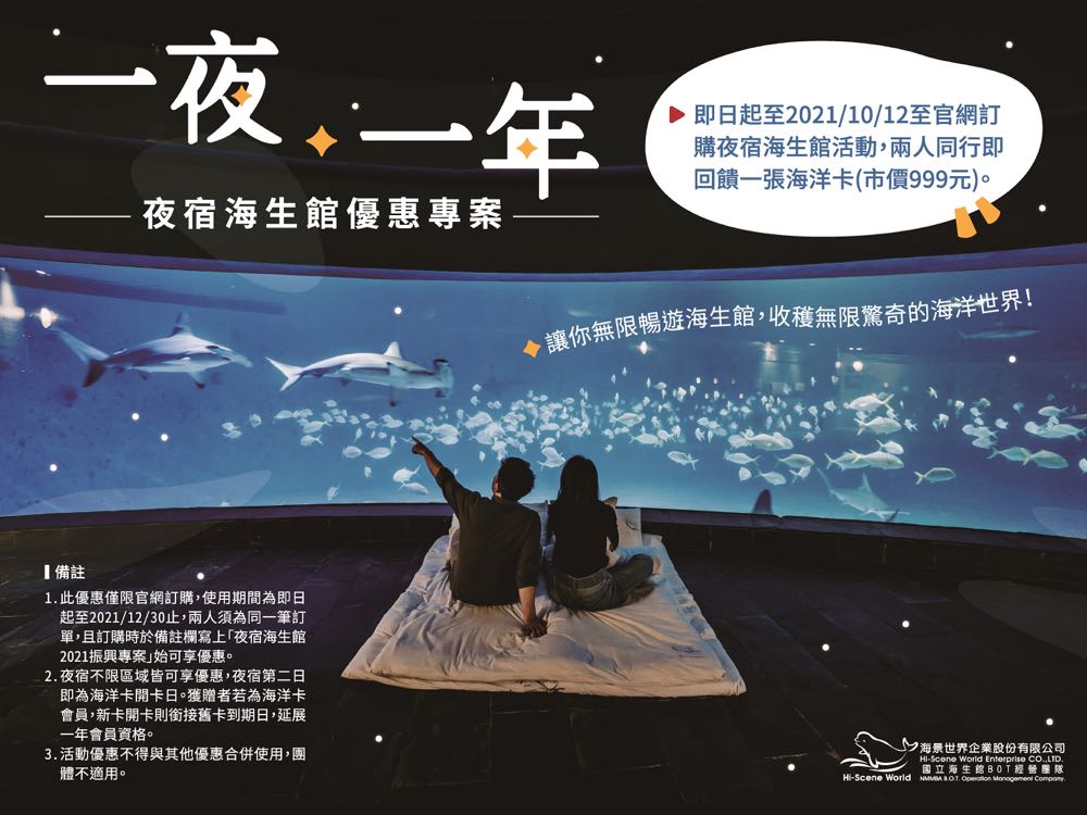 從體驗中認識海洋、進而引發保護海洋的認同,一直是夜宿海生館活動的核心理念。屏東海生館為了讓更多人能夠體驗夜宿海生館活動,透過不同方式親近海洋、了解海洋,也於即日起推出限時優惠專案,只要至 10 月 12 日前於海生館營運團隊海景公司官網訂購兩人同行夜宿海生館,於備註欄填入「夜宿海生館 2021 振興專案」,預約訂購至今年底 12 月 30 日前的夜宿海生館活動,即可獲贈海洋卡一張無限暢遊海生館一整年,讓民眾在各個時節都可以隨心所欲感受海洋奧妙。